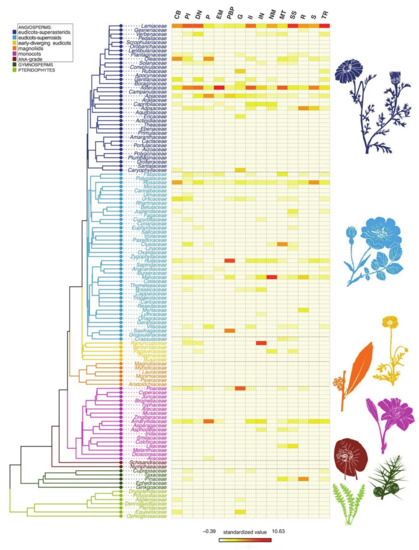 2.7. Phylogenetic Distribution of Families with Medicinal Use