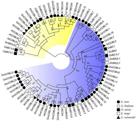 Phylogenetic relationship of COBL genes in soybean, Arabidopsis, rice, cotton, and maize. Multiple alignments of amino acid sequences were performed using ClustalW and the phylogenetic tree was constructed using MEGA X software by the Maximum Likelihood method. The value at the branches represents bootstrap values from 1000 replicates. Five species were represented by five different symbols. Different groups of the COBL family are indicated by colors. Blue is Group I and yellow Group II.