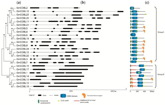 To further study the diversification of the GmCOBL proteins, the domains, motifs, and transmembrane (TM) regions were analyzed (Figure 2c). Protein sequence analysis showed that each protein has a complete and conserved COBRA-like domain. Except for GmCOBL2, all GmCOBL proteins have an N-terminal signal peptide. In Group II, GmCOBL proteins have about 170 additional N-terminal amino acids, making the proteins in this group longer. The distribution of TM regions was variable among GmCOBL proteins.