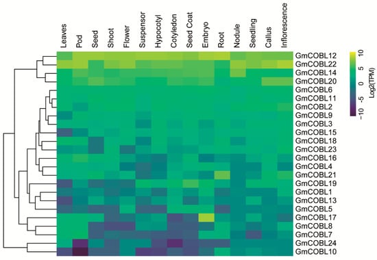 All 24 COBL genes were expressed at least in one of the analyzed tissues and 15 of them were expressed in all analyzed tissues. Most GmCOBL genes showed distinct expression patterns. For example, GmCOBL10, 24, 7, and 8 showed low expression in all tissues. GmCOBL17 was predominantly expressed in the embryo. GmCOBL19 showed higher expressions only in tissues related to seeds (seed, seed coat, seedling, embryo, cotyledon, and suspensor), suggesting a key role in seed germination. GmCOBL12, 22, 14, and 20 showed higher expression levels in all analyzed tissues, suggesting a constitutive role of these genes throughout the soybean life.