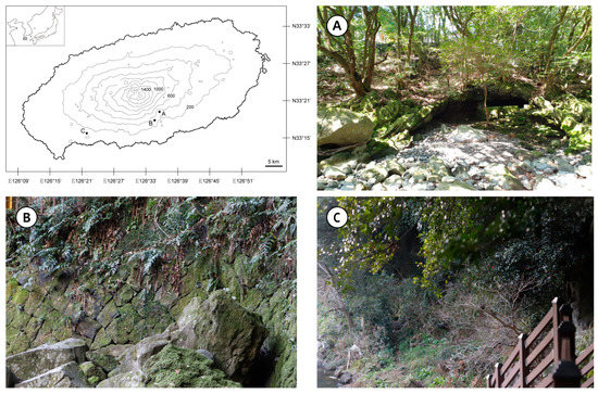 We randomly surveyed a number of valleys to determine the presence of gametophytes and sporophytes of A. obovatum because the condition of the first site was incongruent with the locations where the sporophytes of A. obovatum inhabit tree trunks or rocks [23,33]. As a result, the gametophytes of A. obovatum were newly found at two sites, but the environmental conditions of the sites were slightly different. Site A was a shady bunker built by stacked stones in the upper valley under dry conditions (Figure 1A). A large colony covered the bunker wall. Site B was on the stone wall staircase, 2.7 km away from site A, and was very close to a waterfall and a stream (Figure 1B). Therefore, site B was more humid than site A. A large colony covered the artificial wall. The altitudes of sites A and B were 304 and 290 m, respectively. Site C, which was reported as the first site to contain a population of A. obovatum gametophytes, was close to the stream in a valley but was in an open area (Figure 1C). Therefore, it had relatively dry conditions. A small colony grew on a steep soil slope. We tried to find other populations within a 200 m radius from the three sites because sites A and B were artificial structures that were less than hundreds of years old. However, no other population has been discovered to date.
