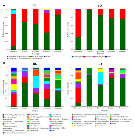 2.3. Community Composition of Root Endophytic Fungi among Different Phenological Stages