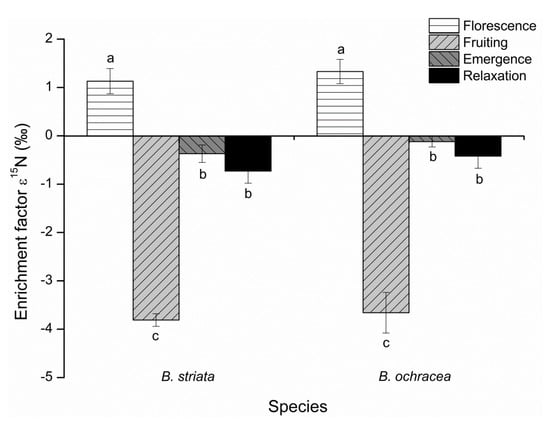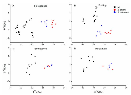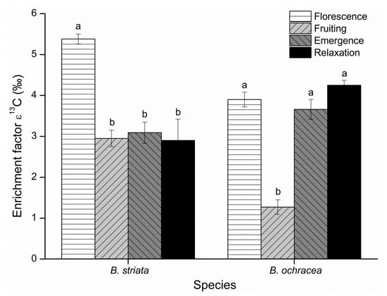| B. striata | −26.02 ± 0.12 aA | −27.22 ± 0.2 aA | −27.1 ± 0.26 aA | −27.29 ± 0.52 aA | 1.46 ± 0.26 aA | −0.63 ± 0.13 bB | 1.51 ± 0.18 aA | 1.15 ± 0.25 aA |