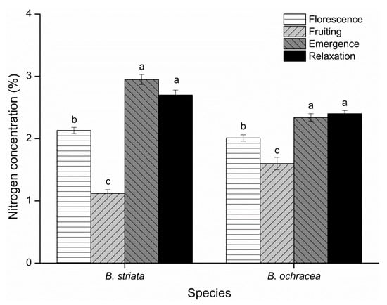2.5. Enrichment Factors and N Concentrations of Two Bletilla Species at Different Phenological Stages