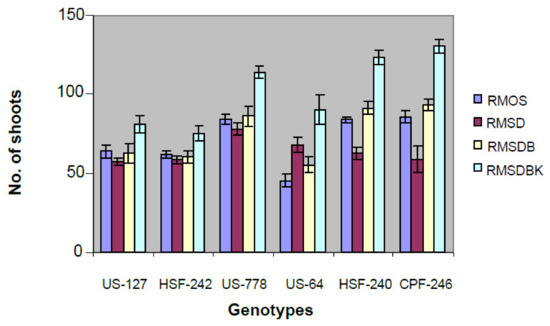 Unfurled leaves from six field-grown elite sugarcane genotypes (CPF-246, US-127, HSF-242, US-778, HSF-240, and US-64) were sacrificed to develop leaf roll discs, and subsequently placed on callus induction medium. Of six genotypes, maximum embryogenic cells were recovered from genotypes US-127, US-778 on MS medium supplemented with 2,4-D (2,4-Dichlorophenoxyacetic acid) ranging from 3 to 5 mg/L. Five-week-old dark proliferated calli were subjected to many combinations of hormones (RMOS, RMSD, RMSDB, and RMSDBK) (Section 4.2) and the maximum number of shoots was observed on RMSDBK medium (Figure 1). However, it was observed that maintenance of 2,4-D in combination with kinetin and BAP (6-Benzylaminopurine) results in healthy and separable mature plants, contrary to earlier studies (Figure 2) [14,15]. BAP, kinetin, and 2,4-D had synergistic effects on shoot regeneration [16,17].