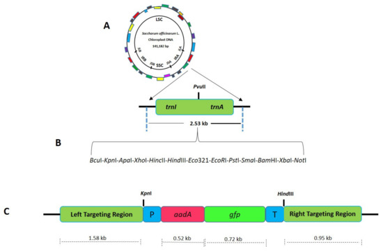 Plastids have become attractive targets for genetic engineering since their genome offers several potential advantages, including accumulation of transporters to high levels with bona fide structures, biological containment of transgenes, gene stacking in operons, and absence of position effects [1,2]. Chloroplast genome has been engineered successfully to develop valuable traits, such as herbicide tolerance, insect and disease resistance, drought or salt tolerance, production of therapeutic proteins, antibodies, antibiotics, vaccine antigens, industrial enzymes, and other biosimilars in different plants [3,4,5]. Hence, more than 100 transgenes have been stably integrated and expressed in the chloroplast genome [6,7,8]. More recently, chloroplast genomes of major crops, including cotton, soybean, vegetables (carrot, lettuce, cabbage, eggplant, sugar beet), fruits (tomato), and trees (poplar and citrus), have been transformed [9,10].