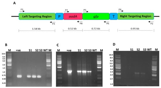 Confirmation of integration of FLARE-S cassette into the plastid genome of sugarcane. (A) Physical map of sugarcane plastid transformation vector showing the position of primers flanking various genes (B) PCR amplification of marker gene (gfp) with primer sets P5/P6: lanes M 1 kb DNA ladder, lane +ve shows amplification from plasmid DNA, lanes S1, S2, and S3 are transformed sugarcane plant DNA, lane WT untransformed sugarcane plant DNA (C) PCR amplification of FLARE-S with primer sets P6/P7: lanes M represent 1 kb DNA ladder, lane +ve represents plasmid DNA as template, lanes S1, S2, and S3 are transformed sugarcane plant DNA, lane WT untransformed sugarcane plant DNA (D) PCR amplification of left border sequence along with marker gene (aadA) with primer sets P1/P8: lanes S1, S2, and S3 are transformed sugarcane plant DNA, lane WT untransformed sugarcane plant DNA, lanes M 1 kb DNA ladder.