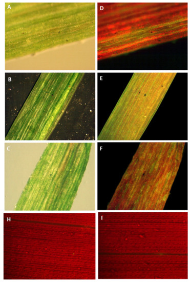 Tracking green fluorescent protein in sugarcane leaves by a stereomicroscope equipped with a GFP detection system. GFP fluoresces green whereas chlorophyll fluoresces red when exposed to fluorescent illumination. (A–C) Images of transformed sugarcane leaves in bright or dark field illumination. (D–F) Images of transformed sugarcane leaves in fluorescent illumination. (H–I) Images of untransformed sugarcane leaves in fluorescent illumination.