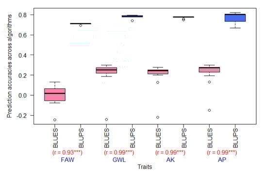 3.1. Higher PAs Achieved for FAW and MW-Resistance Traits with BLUPs when Compared to BLUEs across GP Algorithms