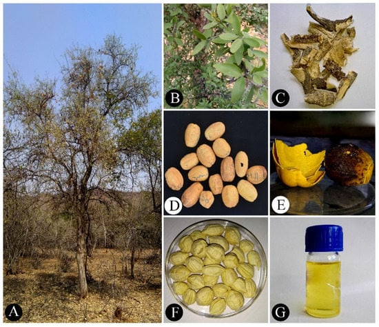 Balanites aegyptiaca (L.) Delile (Family: Zygophyllaceae) is an underutilized fruit-yielding tree (Figure 1A) native to Africa and distributed in tropical and subtropical regions of Africa, from Senegal in the west (16 °W) to Somali in the East (49 °E) and Jordan in the north (35 °N) to Zimbabwe in the south (19 °S). B. aegyptiaca is also distributed in India, Myanmar, Iran, Jordan, Oman, Palestine, Saudi Arabia, Syria and Yemen [1]. Young leaves (Figure 1B) and tender shoots are used as vegetables. Leaves and fruits are used as fodder for livestock [1]. Fiber obtained from tender bark and older dried bark is used for the preparation of medicines (Figure 1C). Unripe and ripe fruits (Figure 1D,E) are edible and popularly known as “desert date”. The fruits are processed into beverages and liquor. Timber is suitable for the construction of furniture, domestic items and musical instruments. The wood produces high-quality charcoal fuel and industrial activated charcoal. Gum or resin produced from stems are used as glue. Seeds contain about 49% edible oil (Figure 1F,G), which is also used in the production of biodiesel fuel [1].