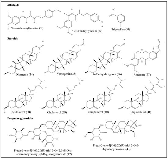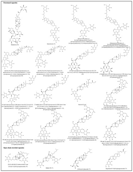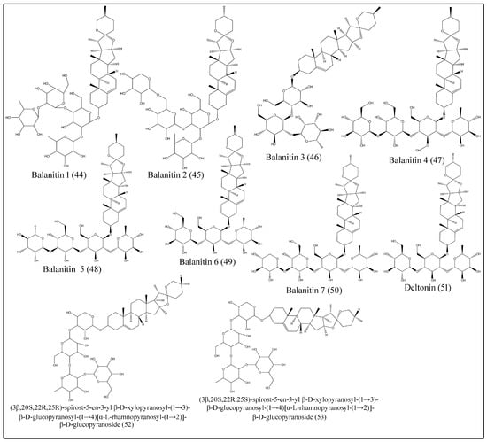 - Hosny, M.; Khalifa, T.; Calis, I.; Wright, A.D.; Sticher, O. Balanitoside, a furostanal glycoside and 6-methyl-diosgenin from Balanites aegyptiaca. Phytochemistry 1992, 31, 3565–3569. [Google Scholar] [CrossRef]