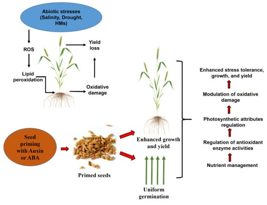 Proposed possible mechanisms used by auxin-and abscisic acid (ABA)-priming and their roles on the germination, growth, and development of plants under different stresses.