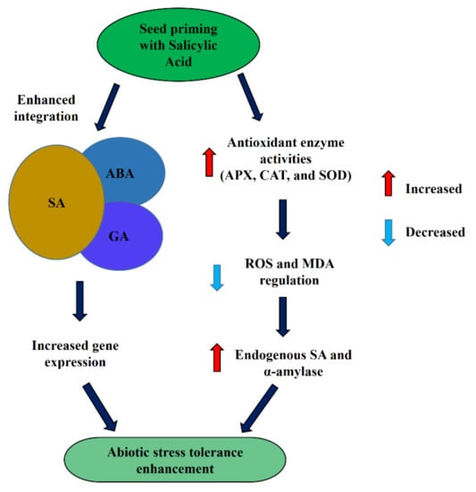 Seed priming with SA mitigated abiotic stresses by enhancing antioxidant enzyme activities such as CAT, APX, and SOD and regulating lipid peroxidation and H2O2 production. Likewise, seed priming with SA also increased the production of osmolytes such as proline and glycine betaine, which play an important role in mitigating different stresses [12,37]. Ion homeostasis and nutrient uptake were regulated by priming with SA at 0.25 mM and 0.50 mM, which enhanced the tolerance of heavy metal stress [130]. In addition, priming with SA at 0.5 mM also enhanced endogenous SA content and α-amylase activity during abiotic stresses [134]. Moreover, priming with SA enhanced the integration affinity among the phytohormones as a result of the GAs biosynthetic gene, and ABA catabolism gene expression enhanced and upregulated the GAs and ABA signaling pathways (Figure 3). In addition to abiotic stress mitigation, priming with SA has an important role in enhancing seed germination and crop productivity. Priming with SA at 100 mg L−1 enhanced emergence and early seedling growth in cucumber [151] and increased germination and productivity of Vicia faba [152] and sesame [153]. It has been reported that rice seeds primed with SA (100 ppm) had increased germination and accelerated seedling growth by ion absorption in PEG-induced water stress [131]. In addition, priming of rice seeds with SA enhanced tolerance to chilling stress by enhancing antioxidant enzyme activities and reducing oxidative damage [132]. SA induced stomatal closure and reduced transpirational water loss from plants [154,155]. Seed priming with SA has a role in the stomatal movement that has not been analyzed, and integration mechanisms with other phytohormones are still unclear.
