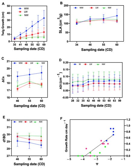 The twig growth rate decreased as the leaf water potential decreased, reaching zero at a leaf water potential of −3.16 MPa (Figure 1F), between 8 and 14 February and coinciding with the fourth sampling date, where the growth rate was zero.