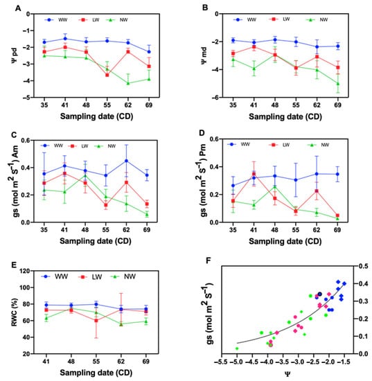 There was a high and constant RWC in all sampling dates in the well-watered treatments (Figure 2E). A decrease in RWC was observed as water stress increased. A very low water content (60.02%) in the third sampling date of the medium stress level was observed (Figure 2E).