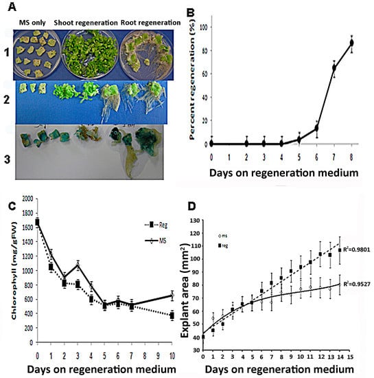We also observed that during the first week on either medium, leaf-segments lost their chlorophyll very quickly (Figure 1C). There was no significant difference in chlorophyll degradation between leaf segments on MS or Reg medium during the first week (Figure 1C). However, 10 days after the segments were placed on Reg medium chlorophyll content started to increase. In contrast, the chlorophyll content of segments placed on MS medium did not increase. The area of the leaf segments on either medium showed similar increases in size during the first seven days (Figure 1D). However, after day seven on Reg medium, segments continued to gain size while segments on MS medium did not (Figure 1D). This observation may indicate that during the first seven days of incubation on Reg medium, both size gain and chlorophyll loss are not related to the medium’s growth regulators’ content. However, as shoot regenerations occur only in the Reg medium, shoot regeneration induction is linked to growth regulators’ presence.