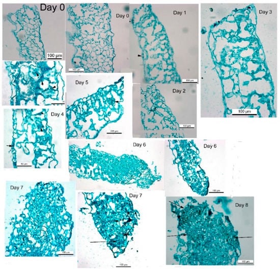Thin sections of leaf segments incubated from 1 to 8 days on Reg medium were examined over the course of the induction period. During the first days after placement on Reg medium (i.e., days 0 and 1), no change was observed in leaf cells below the cut area. The cytoplasm in the cells is very thin, there is no decrease in chloroplast numbers, and most of the cellular volume is occupied by a large vacuole. As the segment stays on the Reg medium, we observed the cytoplasm thickening (Figure 2). The numbers of chloroplasts showed a decline in parallel with the observed decrease in chlorophyll content (Figure 1C). While at day 0 and day 1, the cytoplasm is very thin, thickening of the cytoplasm starts to be visible at days 2 and 3, indicating that some cells are entering into mitosis [32]. Cell divisions are more visible at days 4 and 5 and can be observed more readily as small cellular clusters (Figure 2, short arrows). On days 6 and 7, bigger clumps of cells are observed, and on day 8, pre-shoot structures can be observed (Figure 2, long arrows). The cell clumps appear more organized on day 8 and pre-shoots structures can be distinguished. During the shoot induction period (days 1 to 5), no structures are observed except for cell divisions. The above observations indicated that during the induction period of about 7 days on Reg medium, cell division occurs very rapidly. Still, no meristematic of embryonic structures are visible, although there is a commitment to producing shoots that will be seen sometime in the future.