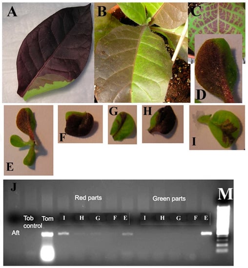 (A–D) Leaves of transformed tobacco show chimerism even on selection medium after transformation with tomato ScANT1 gene construct and selection on Kanamycin. (E–I) Pictures of tobacco leaves transformed with the ScANT1 construct. (J) PCR analysis of genomic DNA isolated from Red or Green sections of the leaves in (E–I).
