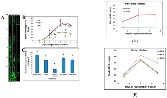 NO has a role in shoot regeneration. (A) NO staining at the border of leaf segments placed on regeneration medium in the presence of NO inhibitor (Reg+I), NO donor (Reg+D) and control (Reg). (B) Stain intensity per cell at the borders of leaf segments during the induction period of shoot induction. NO inhibitor (Regd), NO donor (Regm), and control (Reg). (C) Effect of NO donors (S-Nitroso-N-acetyl-DL-penicillamine; Molsidomine), NO scavenger (PTIO), and NO synthesis inhibitor (Diphenyleneiodonium) on shoot regeneration. Different letters (A, B, C) define statistically different results, p(f) was 7.65 × 10−35 using Tukey test. (D) Transcript level of Nitric Oxide Synthase1 increases during shoot induction while transcript level of Nitric Oxide Synthase2 is unchanged. The data presented are from the Differential Gene Expression experiment. (E) Transcript level of all Nitrate reductase genes increase during incubation on Reg medium. The data presented are from the Differential Gene Expression experiment. Reg = regeneration medium; regm = regeneration medium with added Molsidomine; regd = regeneration medium with added Diphenyleneiodonium. NR = nitrate reductase; NOS = nitric oxide synthase. Error bars indicated standard error of 50 cells in (B); 20 segment in 3 replicated in (C); and 3 biological replicates in (D,E).