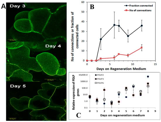 Plasmodesmata (PD) are ubiquitous in plants and used as a means of cell-to-cell communications. We studied the development of plasmodesmatal connections in new cells that grow during the regeneration induction period (0 to 7 days on Reg medium). Leaf segments from transgenic tobacco plants expressing the 35S::AtPDLP5-GFP transgene (a protein that is part of the plasmodesmata structure, [31]) were placed on Reg medium, and PD in the new cells were visualized and analyzed (Figure 6A). The number of PD connections per cell increases from day 4 onwards (Figure 6B), while the fraction of cells with connections remain constant after day 6 (Figure 6B). Analysis of tobacco PDLP genes (NtPDLP2, NtPDLP3, and NtPDLP6) show that the tobacco PD genes start to increase from days four on Reg medium (Figure 6C).