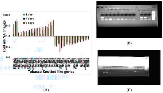 (A) Transcript pattern of Knotted gene family members during the induction period of shoot regeneration. The gene numbers are depicted on the x-axis. (B) expression of NtKnotted1 during the induction period. (C) expression of NtKnotted2 during the induction period.