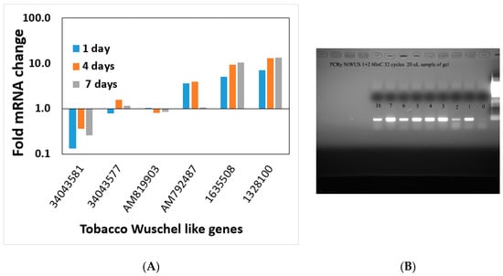 One hundred and two genes were identified in the NAC gene family in tobacco [33,34], but only eight transcripts were identified with varied expression during the shoot induction period (Figure S7). Genes ID 1203313, EH666187, TC18954, and TC23573 increased 30-, 20-, 16-, and 8-fold on day 4 and then dropped on day 7 while genes ID 5124 and 1129698 increased 22-fold and 14-fold, respectively, on day 1 and then fell to 2-fold on day 4 and day 7. Gene ID BP527214 increased 6-5 fold on all days tested compared to day 0, while gene ID 5153 decreased 2.5 fold on day 7 (Figure S7).
