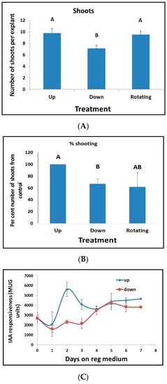 The orientation of leaf segment affects shoot regeneration and percent regeneration. (A) Number of shoots regenerated from leaf segments placed with the segment above the agar Reg medium (Up); leaf segments placed with the segment on the agar and the plates turned upside down, thus, the segment are beneath the agar Reg medium (Down) but still exposed to the air on one side or leaf segments placed with the segment above the agar Reg medium, and the plate was rotated at 30 rotations per min (Rotating). Results are the mean ± se of five repetitions representing 802 leaf segments. Different letters (A, B) define statistically different results (B) Percent regeneration from leaf segments placed as in (A), percent shooting was calculated as the number of segments that produced at least one shoot out of a total number of the segment in a plate. Results are the mean ± se of five repetitions for each treatment. Different letters (A, B) define statistically different results (C) Effect of positioning leaf segments containing the auxin reporter transgene IAA/AUX3::GUS above or beneath the agar medium on IAA responsiveness; up and down as in A. Each point is the mean ± se of five measurements of GUS activity done on ten individual leaf segments.