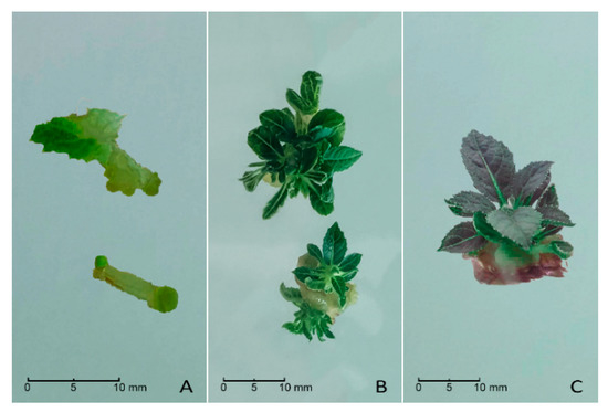 In vitro cultures (Ac174.46 genotype) after co-cultivation with Agrobacterium strains containing pDIRECT22C:gRNAs. (A) Kanamycin-resistant calli appeared along the cut petioles in 4–8 weeks. (B) Kanamycin-resistant adventitious buds regenerated from calli in 12–16 weeks. (C) Putative transgenic shoots ready for in vitro propagation on elongation medium before genetic analyses.