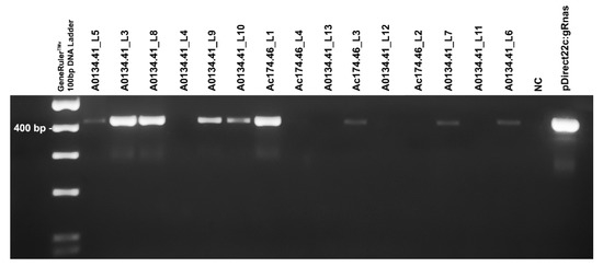 First, T-DNA integration into the recipient plant genomes was tested by amplifying the insert carrying the sgRNA transcriptional cassette within the pDIRECT22C:gRNAs vector. Genome integration was confirmed for seven out of 11 putative transgenic shoots of A0134.41 and two out of four putative transgenic shoots tested for Ac174.46 (Figure 3).