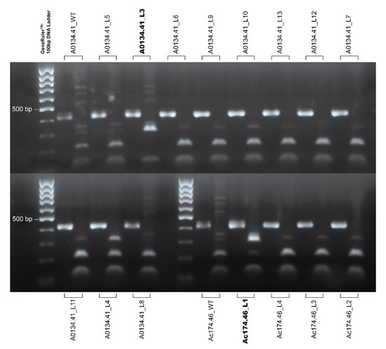 Agarose gel electrophoresis of the sgRNA1 target sequence PCR indigested product and their BslI digestion. The male genotype A0134.41 wild-type (WT), plus the 11 putative transgenic shoots obtained from this male genotype, are displayed in the upper panel of the figure and in the first three rows of the bottom panel of the figure. The male genotype Ac174.46 wild-type (WT) plus the four putative transgenic shoots obtained from this male genotype are displayed in the bottom panel of the figure. GeneRulerTM 100 bp DNA Ladder (Thermo Fisher) was used for sizing the PCR products in the range of 100 to 1000 bp on agarose gel. The plant line code of each sample is reported. The amplicon of the sgRNA1 target assay is 427 bp in length, and its BslI digestion produces three fragments of 221, 98, and 108 bp (the latter two bands appear as one). PCR amplification of some lines, i.e., A0134.41, wild-type (WT), A0134.41_L5, and Ac174.46 wild-type (WT), co-amplifies a second sequence that results in the presence of two extra-bands in the restriction pattern. Thirteen of these plants exhibited a restriction pattern compatible with the wild-type, showing a fragment of 221 bp. The same assay on an edited sequence provides a different digestion pattern, producing two fragments (320 and 108 bp). The edited lines are reported in bold. Image for illustrative purpose. The original image is reported in Figure S4.