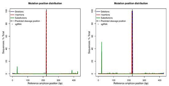 The amplicon used in the restriction assay is 427-bp in length and displays two BslI restriction sites within the wild-type sequence at position 222 nt (the predicted cleavage site defined by sgRNA1) and 320 nt, producing three fragments of 221, 98, and 108 bp after enzyme digestion. In the case of an edited plant, the cutting site at position 222 is supposed to be modified by the editing, providing a different digestion pattern (two fragments of 320 and 108 bp). The BslI assay has been used to test the 15 putative transgenic plants (Figure 4), and a summary of the assay results has been reported in Table 2. Thirteen of these plants exhibited a restriction pattern compatible with the wild type, showing the fragment of 221 bp in length. In contrast, two different transgenic shoots, named A0134.41_L3 and Ac174.46_L1 (in bold in Figure 4), showed an electrophoresis pattern with only two fragments (320 and 108 bp in length), consistent with pervasive DNA modification in all the cells of these samples or in most of them, considering the limits of sensitivity of this technique. Based on this preliminary information, we set out to carry out a definitive evaluation and characterization of the editing products in a subset of selected plants by amplicon sequencing of the genomic targets with Illumina technology.