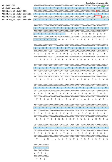 Alignment of coding sequences (CDS) of Wild-Type SyGI (WT) and edited SyGI in the A0134.41_L3 and Ac174.46_L1 lines. PAM sequence is underlined in green. In the WT SyGI CDS, the predicted cleavage site is underlined by a stuttered line, and it has been found three bases upstream of the PAM sequence. The insertion of a single A in plant line A0134.41_L3 and the deletion of five bases plus the insertion of a single G in plant line Ac174.46_L1 are underlined in red. Protein translation is shown; in both edited lines, the modifications cause a reading frame shift, with a consequent formation of a premature stop codon.