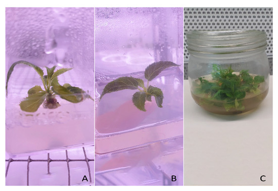 In vitro culture of the regenerated plantlets. (A) Non-edited line A0134.41_L8 on elongation medium. (B) Edited line Ac174.46_L1 on elongation medium. (C) Edited line A0134.41_L3 propagated on shoot induction and maintenance medium.