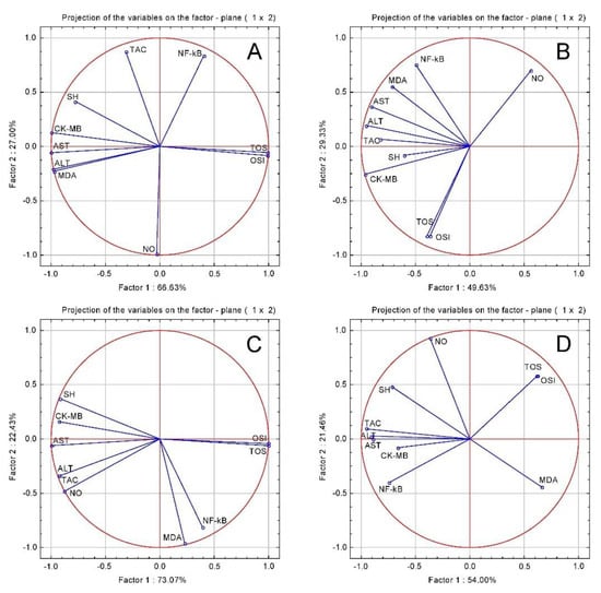 Oxidative stress tests and cardiac function tests PCA results: (A) ISO group; (B) CHT; (C) CHT 1:1; (D) CHT 1:3.