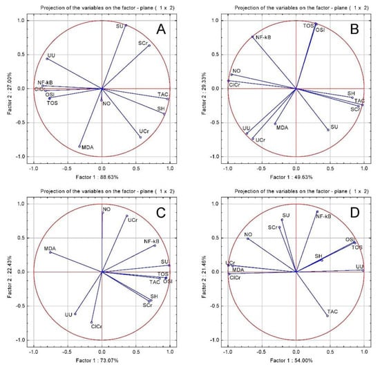 Oxidative stress and renal function tests PCA results: (A) GENTA group; (B) CHT; (C) CHT 1:1; (D) CHT 1:3.