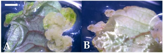 Callus induction from the leaf culture of strawberry after a 4-week culture (bar). (A) Thidiazuron (TDZ) 2.27 µM and 2,4-dichlorophenoxyacetic acid (2,4-D) 0.45 µM combination (1 mm); (B) TDZ 4.54 µM and 2,4-D 2.27 µM combination (1 mm).