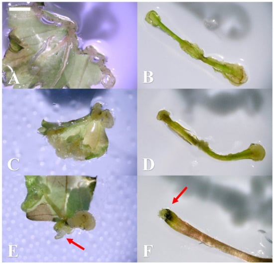 Callus induction and shoot regeneration using different explants (bar). After a 2-week culture, calli were found on (A) the whole leaf and (B) the petiole explants under the thidiazuron (TDZ) 4.53 µM and 2,4-dichlorophenoxyacetic acid (2,4-D) 2.27 µM combination (1 mm) in the dark condition. After a 4-week culture, both calli and shoots were observed. More calli were seen in (C) the whole leaf and (D) the petiole explants culture under the TDZ 2.27 µM and 2,4-D 2.27 µM combination (1 mm). The shoots started to develop in (E) the whole leaf and (F) the petiole explants culture under the TDZ 4.54 µM and 2,4-D 0.45 µM combination (1 mm).