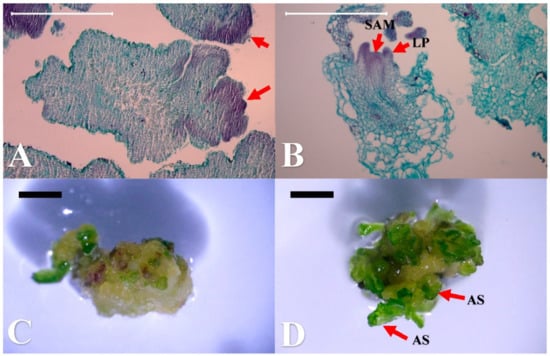Histological observation of the shoot regeneration from wild strawberry (Fragaria vesca) calli after 2 weeks of culturing, with their corresponding development stages (bar). (A) Meristematic cells originated from the cells of the callus explants (500 μm); (B) shoot organogenesis with leaf primordium (LP) and shoot apical meristem (SAM) (500 μm); (C) the corresponding developmental stage of the callus explants corresponding to (A) (1 mm); (D) the stage of adventitious shoot (AS) development corresponding to (B) (1 mm).