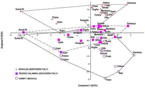 The PCA confirmed that in the years considered the tested cultivars performed consistently in the three different geographical areas with regards to the susceptibility to the disease. In general, cultivars grew better and showed a higher productive performance in northern Italy, while the grain quality in terms of protein content and thousand-kernels weight was better in southern Italy.