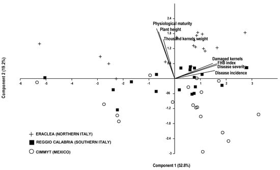 With the aim of summarizing the results, a Principal Component Analysis (PCA) was carried out on the seven parameters common to all three experimental sites, CIMMYT (Mexico), Eraclea (northern Italy) and Reggio Calabria (southern Italy), i.e., proportion of damaged kernels, disease severity, disease incidence, FHB index, plant height, physiological maturity and thousand kernels weight (Figure 1).