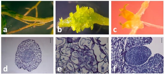 Direct somatic embryogenesis (SE) in Centaurium erythraea solid root culture. (a) The first response of root explant is enlargement and clear morphological changes observed five days after the culture setup on half-strength Murashige and Skoog (½MS) medium, (b) Detail of root explant with somatic embryos, (c) Cotyledonary somatic embryos developed directly from the root explant with no intervening callus phase, (d) Cross-section of root explant at the beginning of the culture. Scale bar indicates 200 μm, (e) Histological appearance of a proembryogenic structure. Scale bar indicates 100 μm, (f) Somatic embryo originated directly from the epidermal and subepidermal cells of the root tissue. Scale bar indicates 100 μm.
