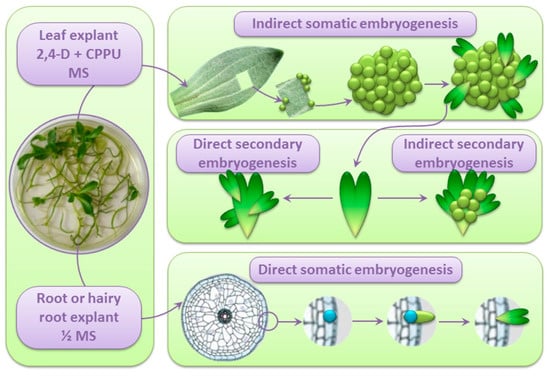 The successful induction of SE, as well as shoot and root regeneration in vitro, depends on a variety of factors, including the explant selection, light conditions, and exogenously added PGRs [5,57]. The leaf culture, implying in vitro cultivation of isolated leaves, is generally not used because the whole leaves cannot be maintained in tissue culture. However, if the leaf sections are used as initial explants, then calli, buds, or somatic embryos can be induced since some mesophyll cells have the potential to re-enter the cell cycle and become committed to different morphogenetic pathways when appropriately induced. Leaves from in vitro cultivated plants are an easily accessible source of explants, while the leaf culture enables the regeneration of genetically stable plants [58].