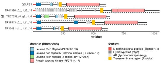 As discussed above, a homology-based search revealed only four AGP sequences in the first version of the C. erythraea transcriptome, all of which were AGPs with conserved domains [103]. This was expected since HRGPs, including AGPs, are intrinsically disordered proteins lacking hydrophobic core, so the sequence constraints imposed on these proteins are relatively low. Therefore, AGPs can rapidly mutate and evolve, which hinders their homology-based mining [90]. We have recently developed a highly sophisticated bioinformatics pipeline developed in R, ragp, for mining and analysis of HRGPs with an emphasis on AGPs [90]. The key novelty incorporated in ragp is the machine learning-based prediction of proline hydroxylation sites, which represent the glycosylation sites. The analysis of C. erythraea transcriptome [118] as well as 62 plant proteomes using ragp [90] revealed, quite unexpectedly, that the most frequently identified domains found in AGPs were the Protein kinase and Protein tyrosine kinase domains. The Protein (tyrosine) kinase domains have thus far eluded experimental evidence for linkage with AGPs in any plant species. Possible implications of this finding include a novel way of attachment of AGPs to the plasm membrane through their transmembrane domains and a novel way for the involvement of AGPs in signaling. So far, structural features of AGPs and circumstantial evidence suggested that AGPs may be involved in signaling as co-receptors [97], or through interaction with membrane receptors (including protein kinases) on the same or neighboring cell [11,91,93], interaction with other AGPs, pectins, and other cell wall or cytoskeletal elements [89,93]. The presence of protein kinase domains on ragp-predicted AGPs suggests that AGPs may actually be the membrane receptors themselves or that certain Protein kinases have previously undetected AG-glycomodules and can be glycosylated. While the experimental evidence for the Hyp-glycosylation of these protein kinases is lacking, and the functions of the proposed “AGP-Protein kinase” molecules are unknown, it should be noted that, for example, A. thaliana SERK5 (AT2G13800.1) has predicted hydroxyprolines organized in characteristic AG-glycomodules [90,118] (Figure 5). The analysis of expression and function of “AGP-Protein kinases” and their possible involvement in SE in C. erythraea is planned.