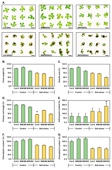 Phenotypic and physiological responses of Col-0, MIM399 and MIR399 plants to salt stress. (A) Phenotypes displayed by 15-day-old Col-0/Ns, MIM399/Ns, MIR399/Ns, Col-0/NaCl, MIM399/NaCl and MIR399/NaCl seedlings. Quantified phenotypic parameters of fresh weight (B), rosette area (C) and primary root length (D) for 15-day-old Col-0/Ns, MIM399/Ns, MIR399/Ns, Col-0/NaCl, MIM399/NaCl and MIR399/NaCl seedlings. Quantification of the physiological parameters of anthocyanin (E), chlorophyll a (F) and chlorophyll b (G) content in 15-day-old Col-0/Ns, MIM399/Ns, MIR399/Ns, Col-0/NaCl, MIM399/NaCl and MIR399/NaCl seedlings. Error bars represent the standard deviation of four biological replicates and the presence of an asterisk above a column represents a statistically significant difference in either a phenotypic or physiological parameter between the Col-0 plants and the MIM399 and MIR399 transformant lines (p-value: * < 0.05).
