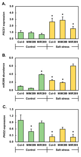 RT-qPCR analysis of P5CS1, miR399 and PHO2 transcript abundance in 15-day-old control and salt-stressed Col-0, MIM399 and MIR399 seedlings. Quantification of P5CS1 (A), miR399 (B) and PHO2 (C) expression via RT-qPCR assessment of 15-day-old control and salt-stressed Col-0, MIM399 and MIR399 seedlings. Error bars represent the standard deviation of four biological replicates and the presence of an asterisk above a column represents a statistically significant difference in the abundance of an assessed transcript between the Col-0, MIM399 and MIR399 plant lines (p-value: * < 0.05).