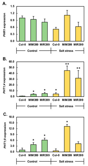 Quantification of PHR1, PHT1;4 and PHT1;9 expression via RT-qPCR analysis of control and salt-stressed Col-0, MIM399 and MIR399 15-day-old Arabidopsis seedlings. Assessment of the expression of PHR1 (A), PHT1;4 (B) and PHT1;9 (C) in 15-day-old control and salt stressed Arabidopsis plant lines, Col-0, MIM399 and MIR399. Error bars represent the standard deviation of four biological replicates and the presence of an asterisk above a column represents a statistically significantly difference in the abundance of an assessed transcript between the compared Col-0, MIM399 and MIR399 plant lines (p-value: * < 0.05; ** < 0.005).