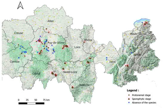 Buxbaumia viridis was found in 79 forests spread over the 12 French departments (Figure 1). In 50 of them the protonemal stage was found. Sporophyte stage was found in 29 of them, which was always accompanied by gemmae.