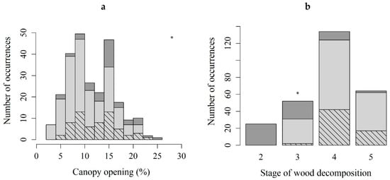 The number of occurrences of the protonemal stage of Buxbaumia viridis (light gray) and the sporophyte stage (hatched) classified by canopy opening (a) and stage of wood decomposition (b). Dark gray: total stands surveyed. The two variables were significantly different between microhabitats with sporophytes, and those with protonemal stage only (Kruskal–Wallis chi-squared = 31.254, df = 1, p-value < 0.05 for canopy opening, and χ2 test, p < 0.05 and absolute residual value > 2 for stage of wood decomposition); * p ≤ 0.05.