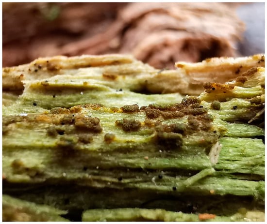 Buxbaumia viridis (Moug. ex Lam. et DC.) Brid. ex Moug. et Nestl. (Buxbaumiaceae) is a hygrophilous, sciaphilous, and acidophilous species, widely distributed in the Northern hemisphere, where it mainly colonizes decaying wood in wet, shaded coniferous montane woodlands [1,2,3]. Ecological factors, that have been suggested as relevant in explaining the occurrence of the species, are the amount of available deadwood, the degree of its decomposition, canopy openness, humidity, elevation, aspect, and deadwood composition [3,4,5]. As a species apparently linked to well-preserved forest stands with large accumulations of bulky woody debris, it has been suggested that B. viridis is an indicator of ancient woodland [5].