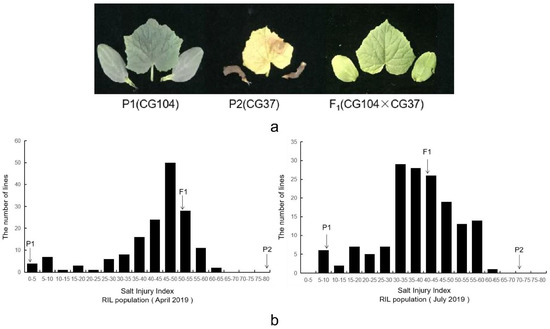 Frequency distribution of salt injury index among the recombinant inbred line (RIL) population. (a) Performance of the resistant parental line ‘CG104’, the sensitive line ‘CG37’ and their F1 hybrid progeny at 7 d after 200 mmol·L−1 NaCl treatment; (b) Frequency distribution of the salt injury index among the ‘CG104’ × ‘CG37’ RIL population in two treatments. The abscissa indicates the salt injury index of the RIL population, the ordinate indicates the number of lines. The frequency distributions in April 2019 and July 2019 each presented a continuous distribution from resistant to sensitive phenotypes.